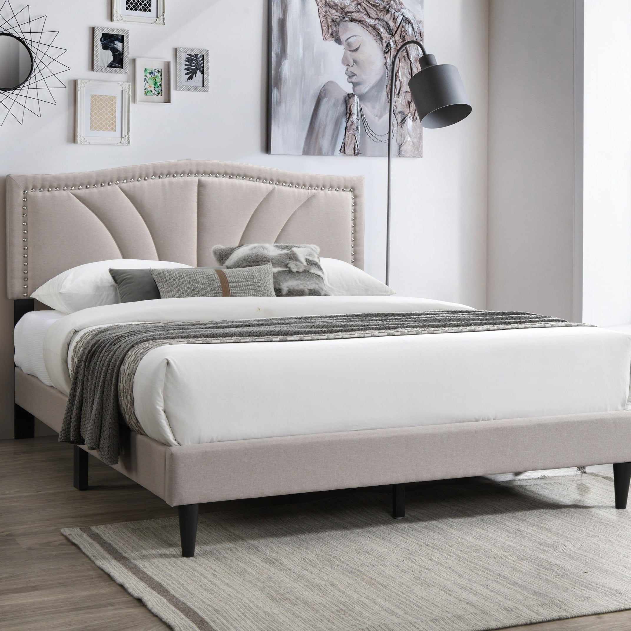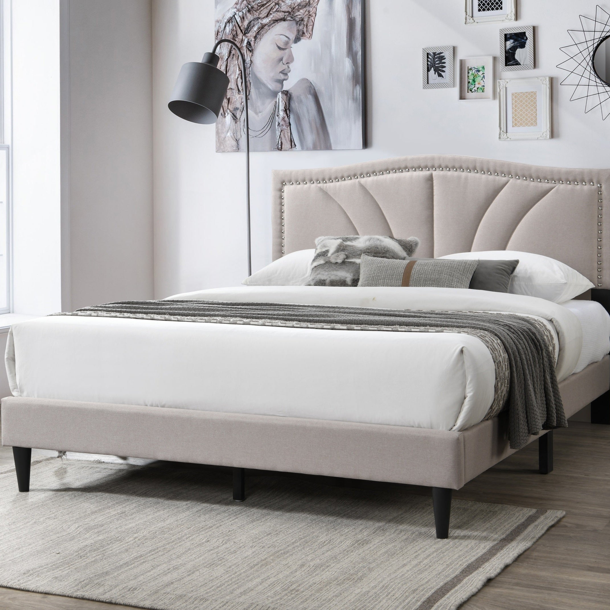 Modern Vintage Queen Size Bed Light Brown Nailhead Trim Accents Headboard Bedframe