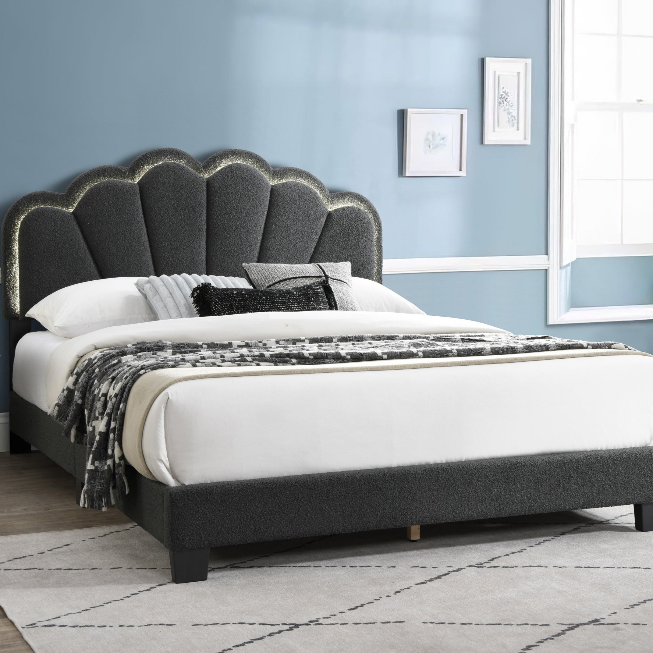 Modern Charcoal Wool Fabric Floral Design Headboard Queen Size Bed