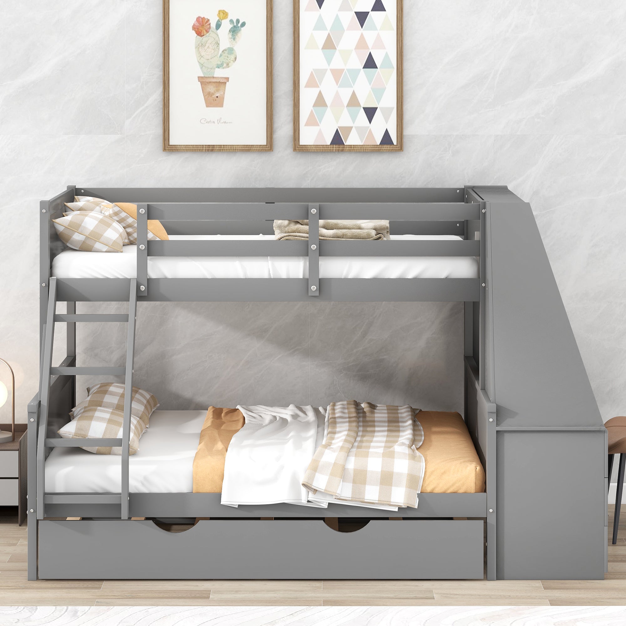 Gray Twin over Full Bunk Bed with Drawer Stairway Guard Rail