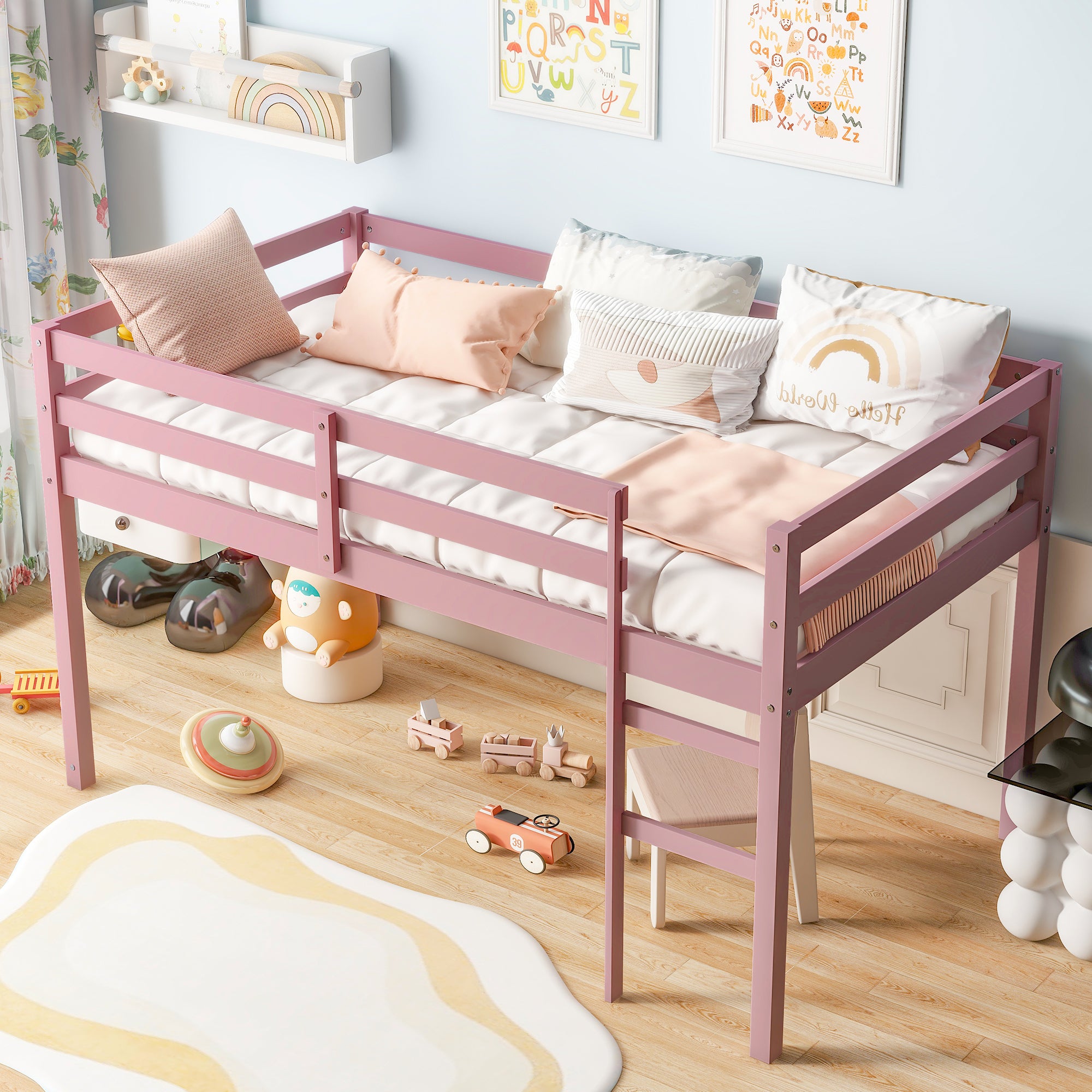 Rubber Wooden Twin Loft Pink Bed with Ladder
