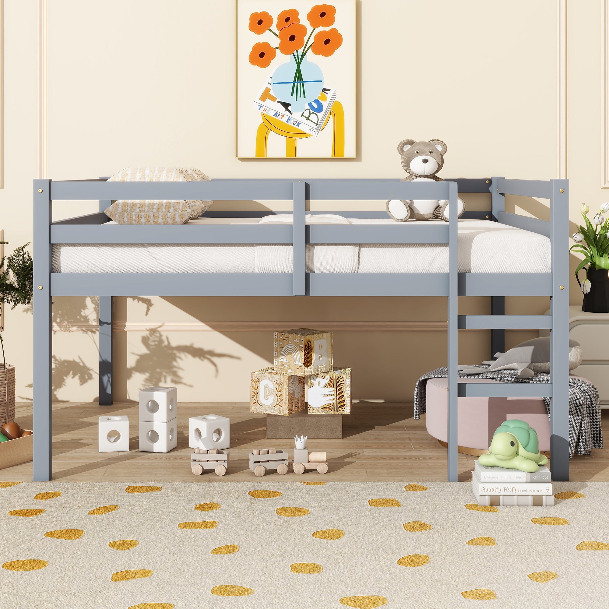 Solid Rubber Wooden Grey Twin over Twin Floor Bunk Bed with Ladder