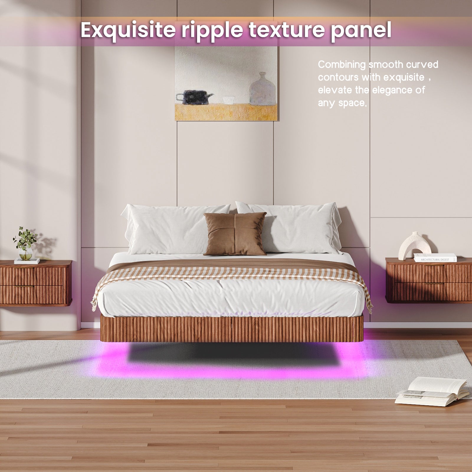 Walnut Queen Floating Bed Frame with LED Lights