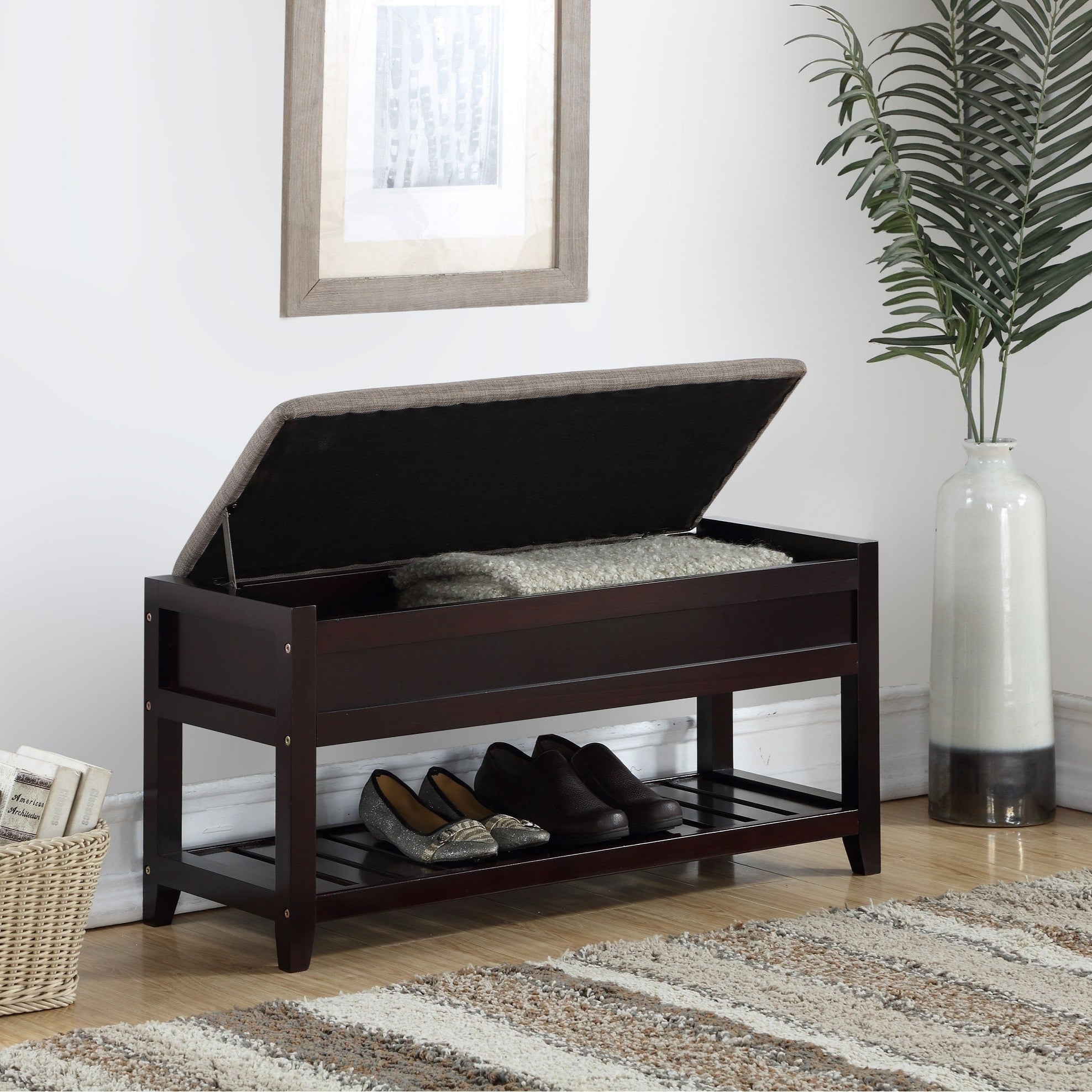 Gray Fabric Storage Shoe Bench With Lift-Up Seat Cushion