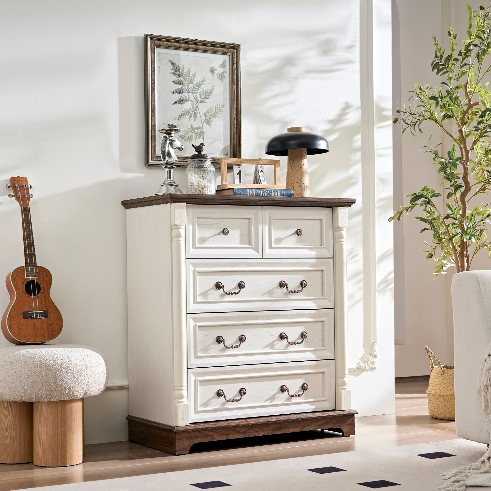 Farmhouse 5 Drawer Dresser Chest with Base Wooden Rustic Chest of Drawers