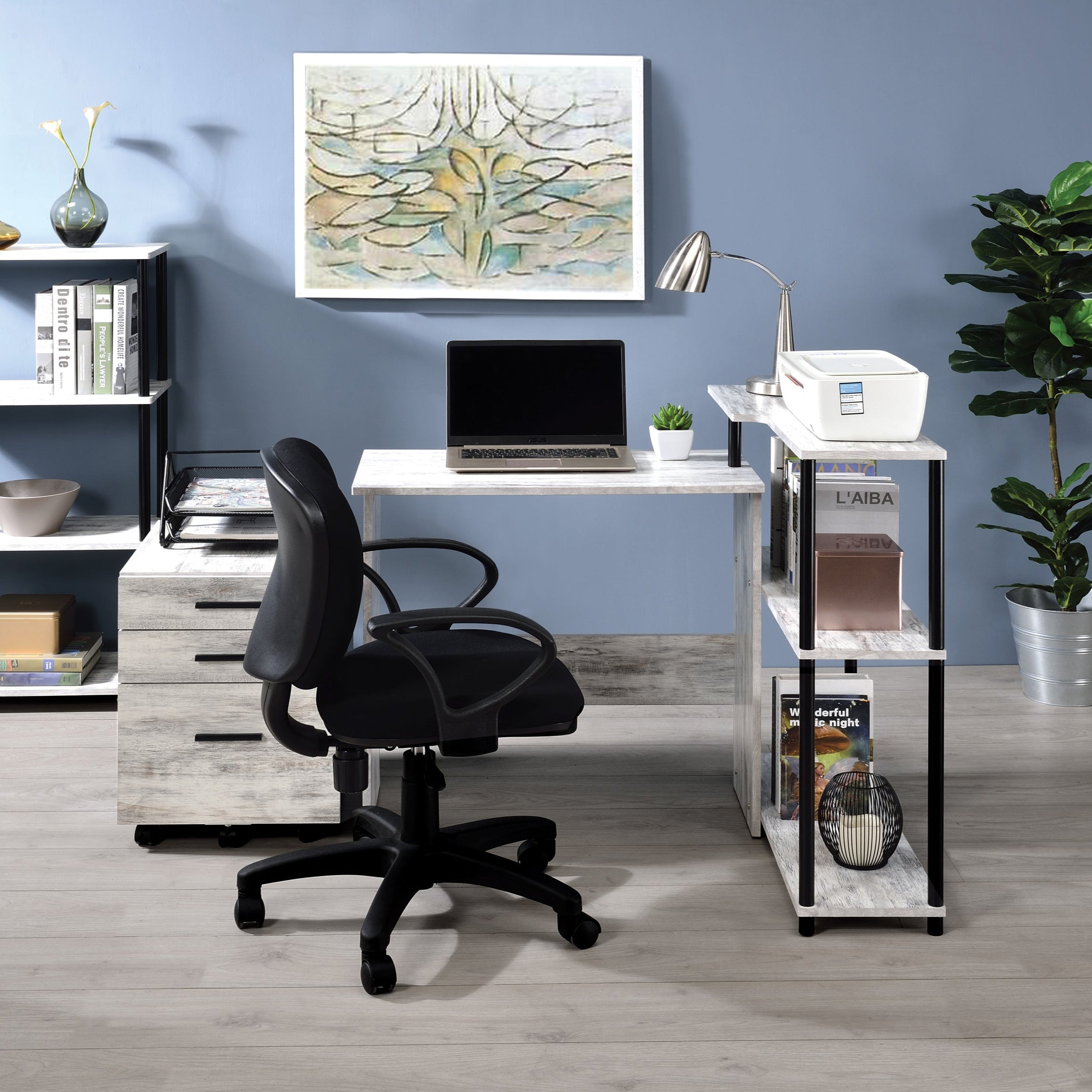L-Shaped Home Office Desk With Two Shelves Single Door Cabinet