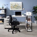 - This L-shaped writing desk is available in three distinct finishes: Weathered Oak & Black, Antique White & Black, and solid Black, catering to various decor preferences.